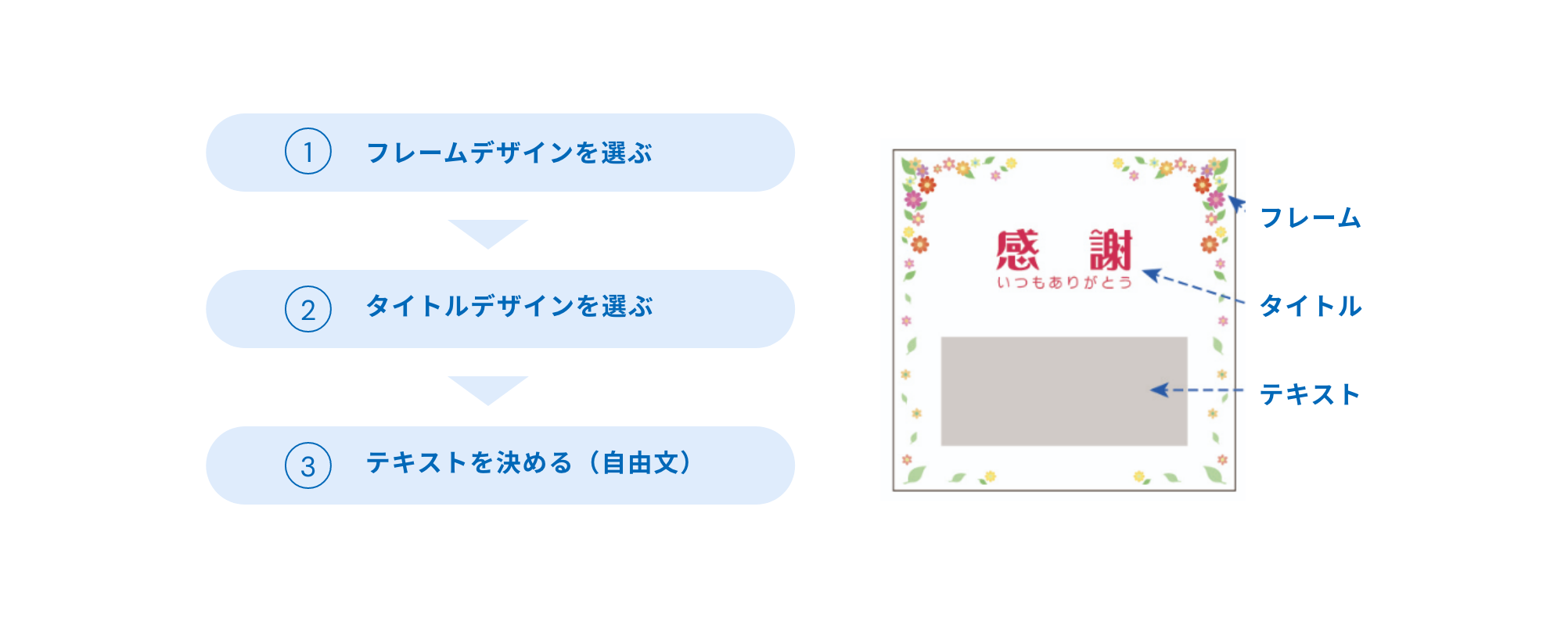 ノベルティワイパーのフレームデザインとタイトルデザインはそれぞれ20種類ずつご用意。お客様の目的に合わせて、それぞれのデザインをカスタマイズしていただけます。 また、フレームには、お客様のお名前や会社名を入れることができます。(フレームデザイングレー網掛け部分) もちろん、完全オリジナルデザインのデータ入稿も可能です。